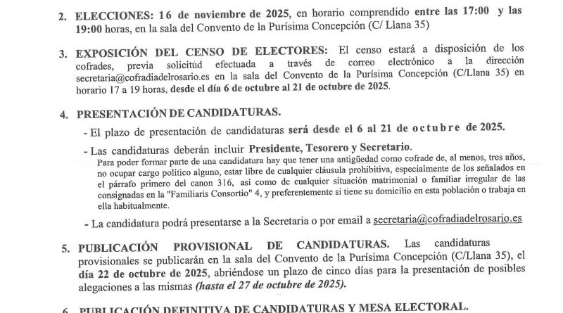 ActualidadCofradía Asamblea General de Elecciones 2025 09/10/2025 admin convocatoria electoral firmadaDescarga PUBLICACION MESA ELECTORAL ROSARIODescarga PUBLICACION PROVISIONAL DE CANDIDATURAS ROSARIODescarga
