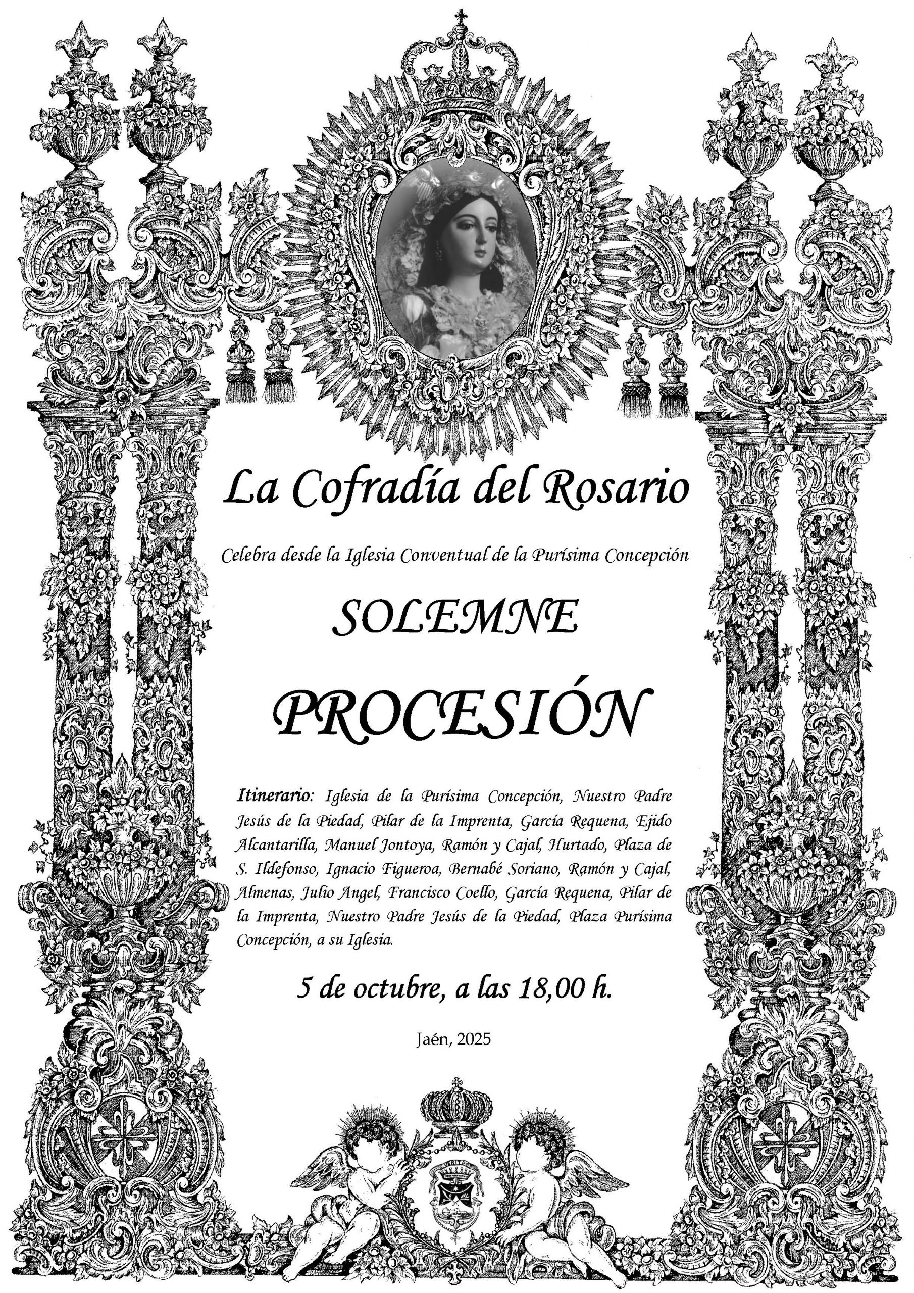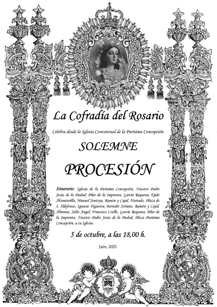 Actos y CultosCofradía Procesión de Ntra. Sra. del Rosario 2025 11/09/2025 admin El próximo día 5 de octubre Ntra. Sra. del Rosario procesionará por las calles de Jaén con el siguiente itinerario: